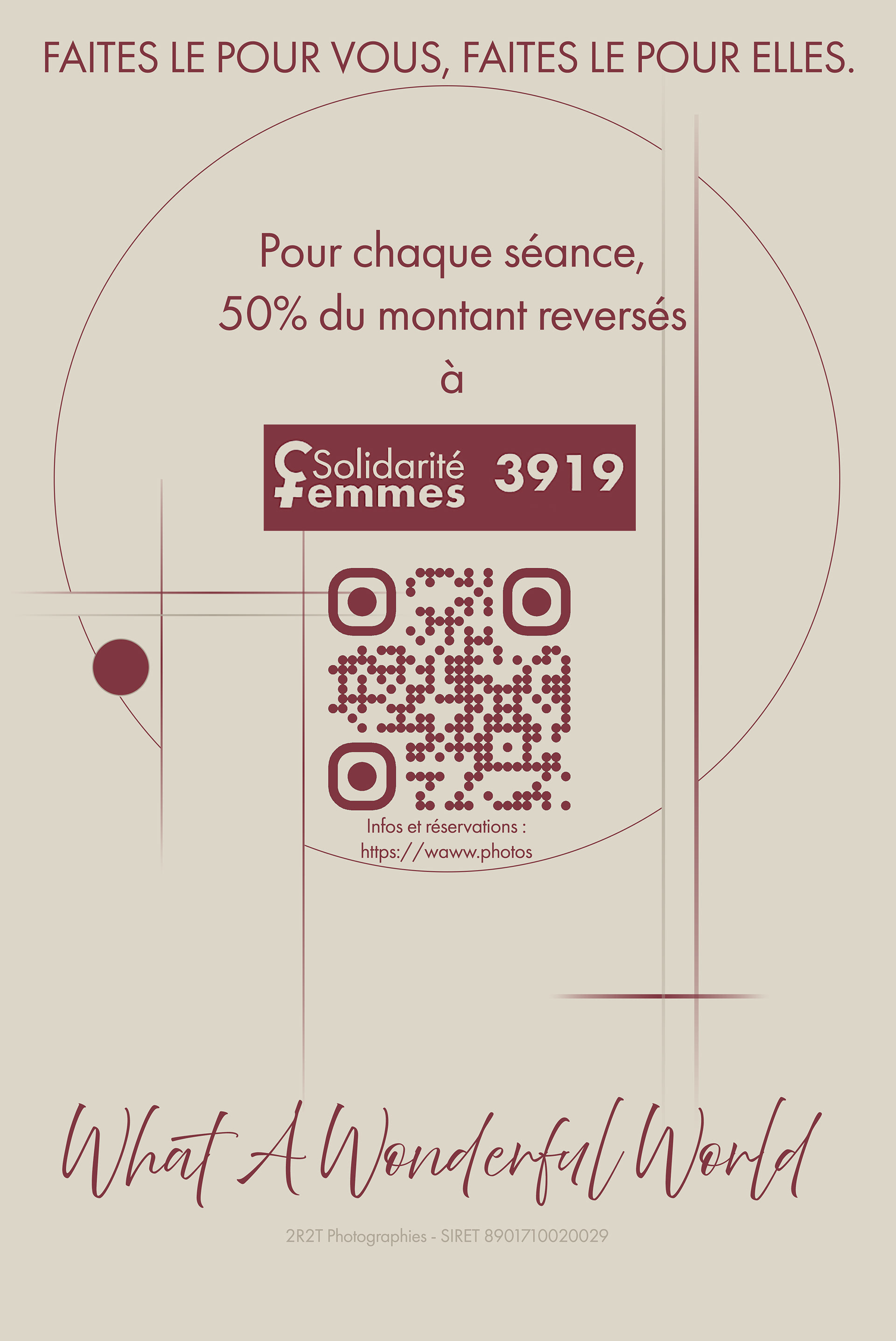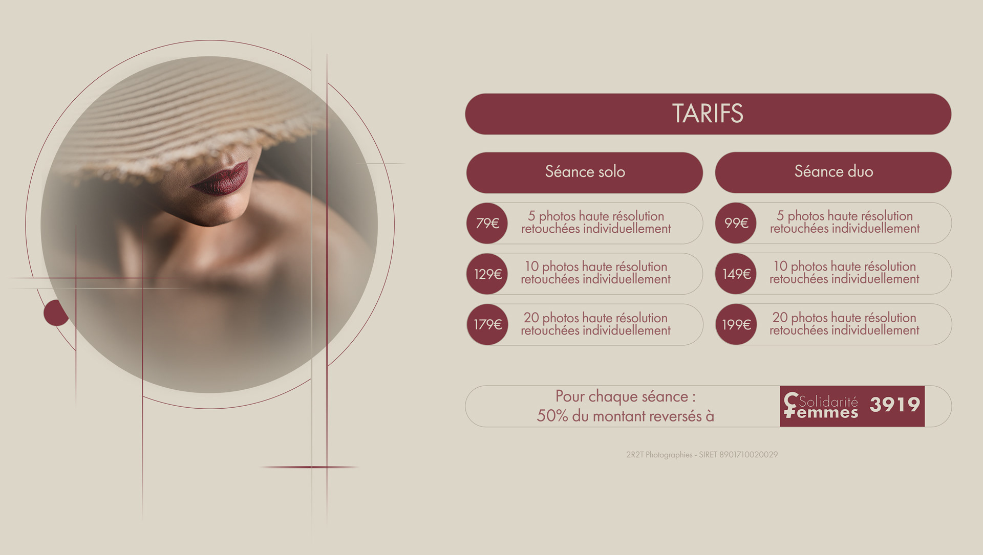 Je travaille principalement avec des modèles féminins, et j'attache une grande importance à la bienveillance et au respect durant les séances. J'ai donc décidé de reverser la moitié* du montant de chaque shooting que vous paierez à une association qui aide les femmes victimes de violences. Vous vous faites plaisir en vous offrant un moment rien qu'à vous, et ensemble nous apportons notre soutien aux femmes qui en ont besoin. * L'autre moitié couvre les frais généraux (URSSAF, assurance, amortissement du matériel, etc.).